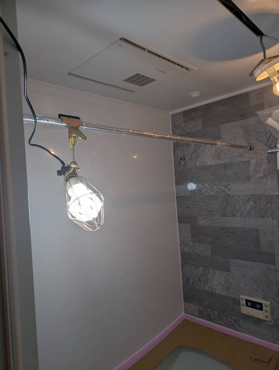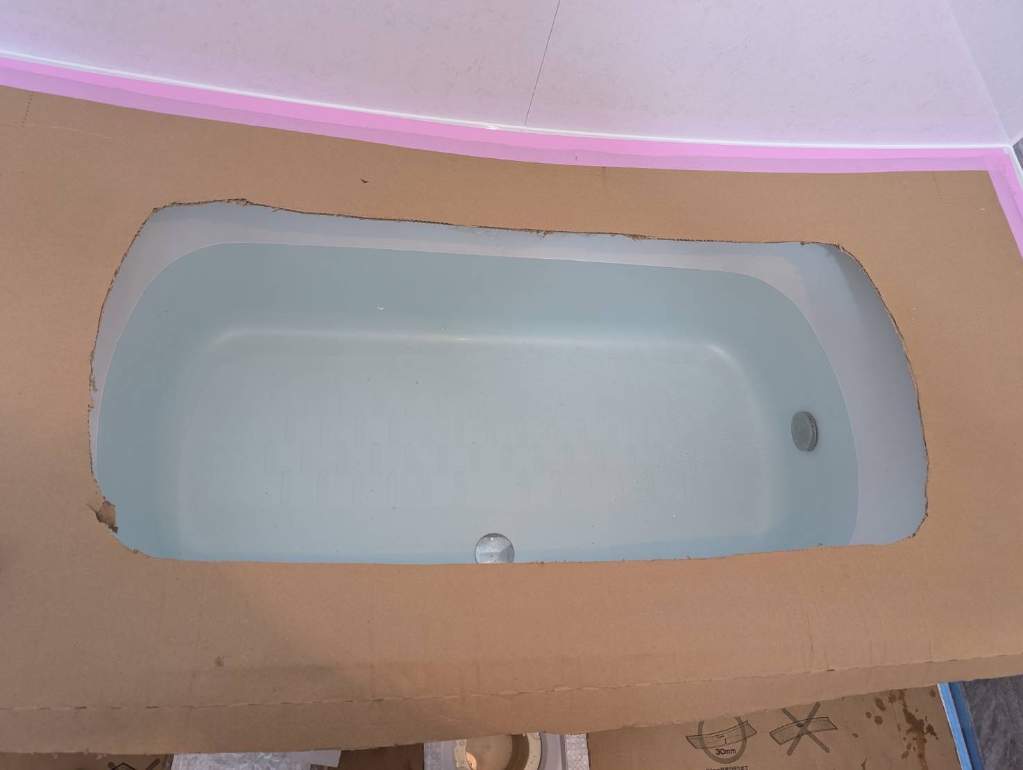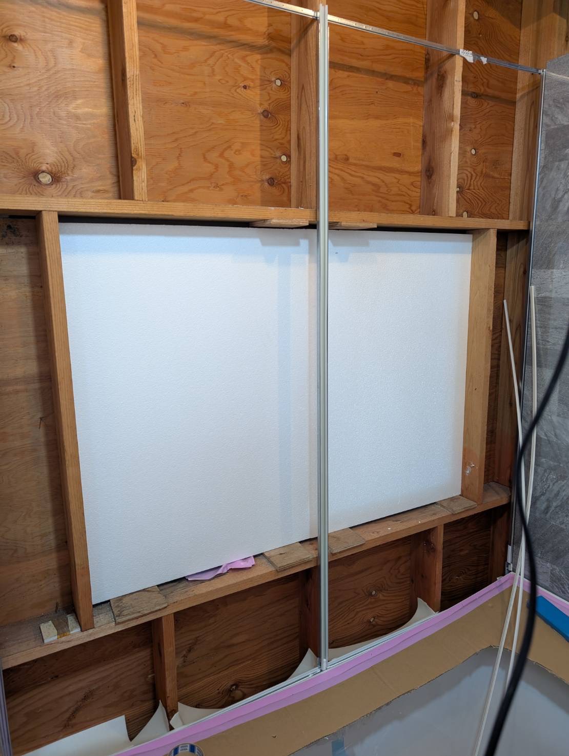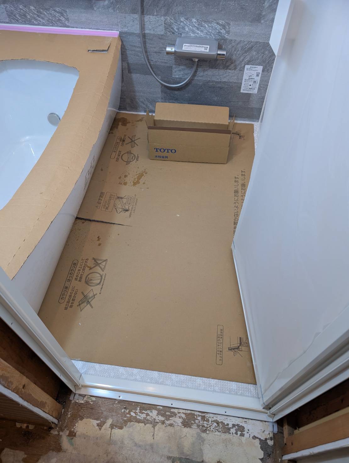 ○○様邸_TOTOサザナ1616 窓の冷気が寒いとの要望で窓を潰しました。 また、窓に断熱材を貼り、ユニットバス天井、壁パネル、床パン、浴槽の裏にも断熱を入れました